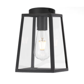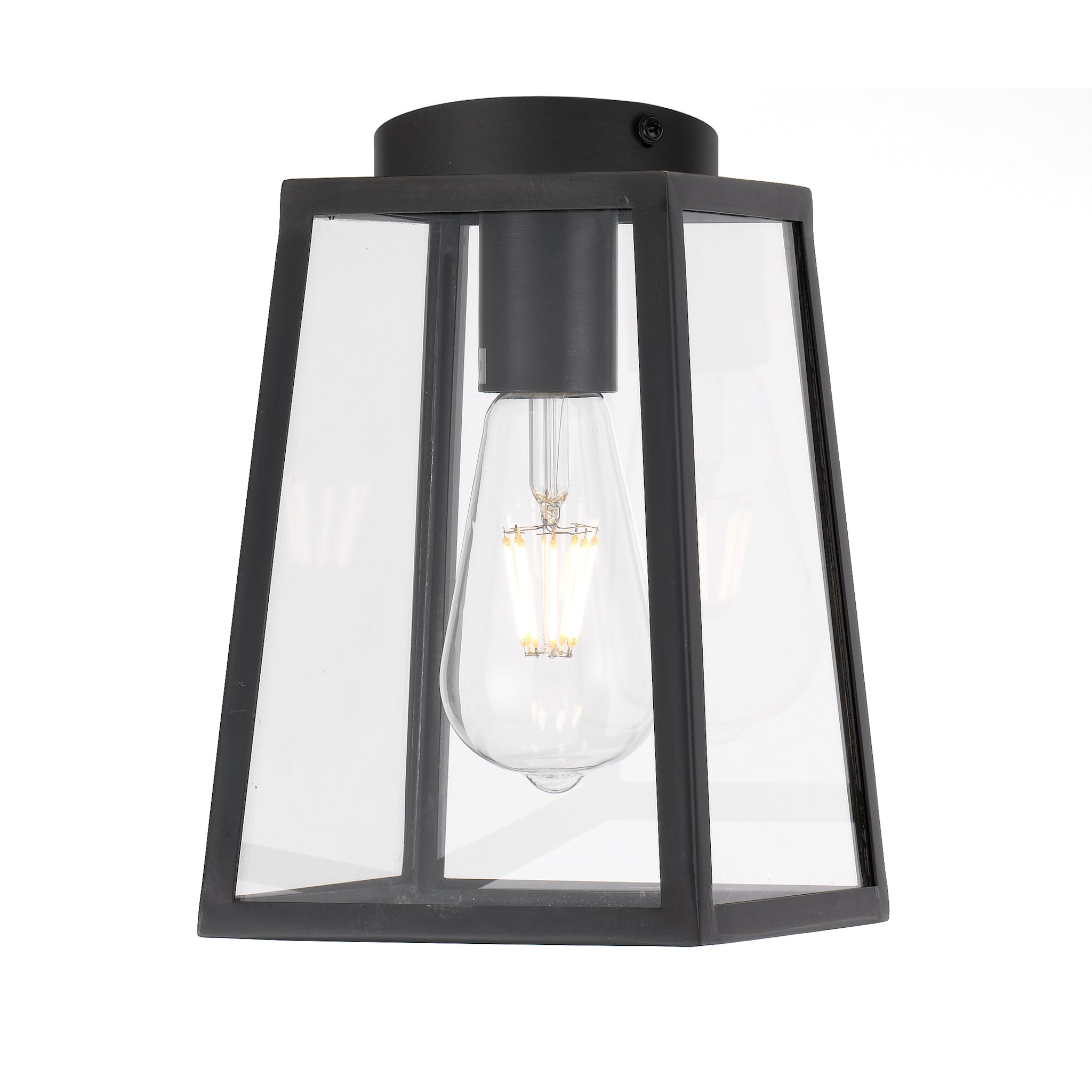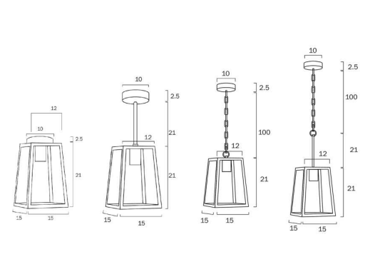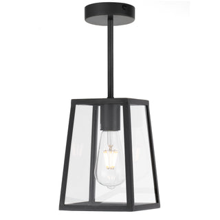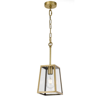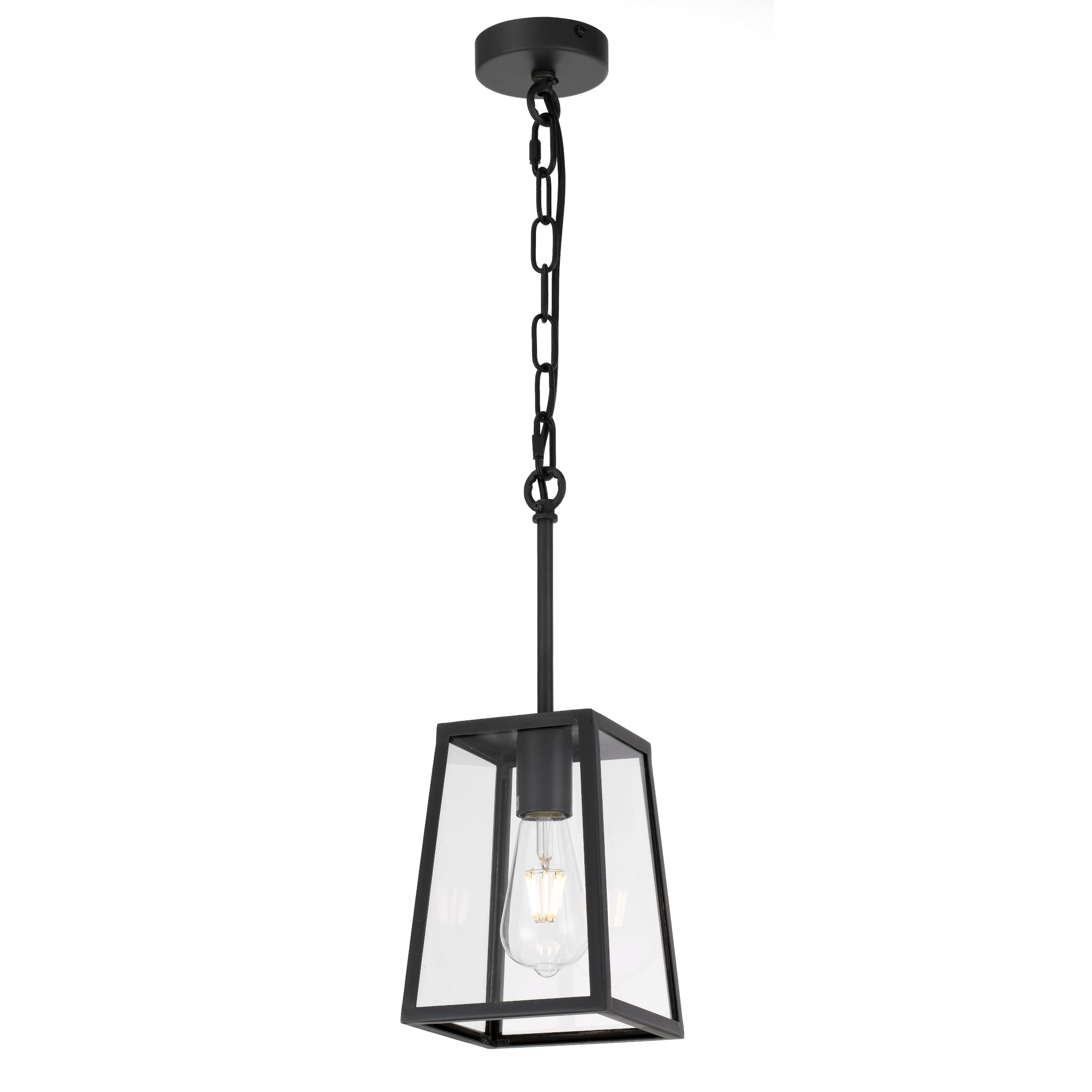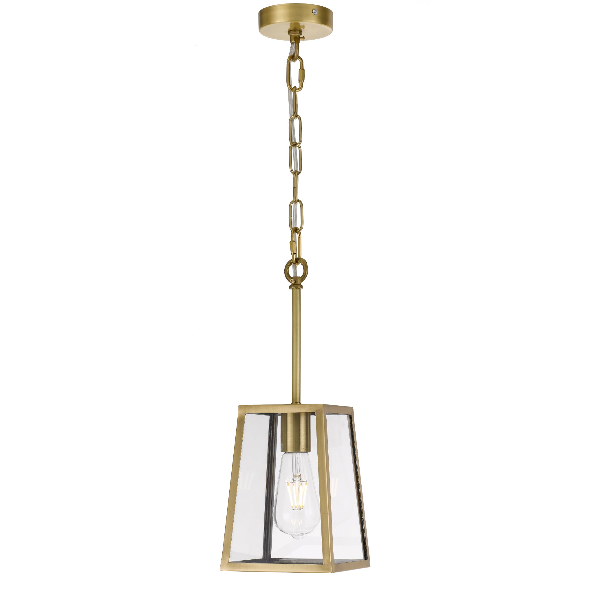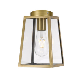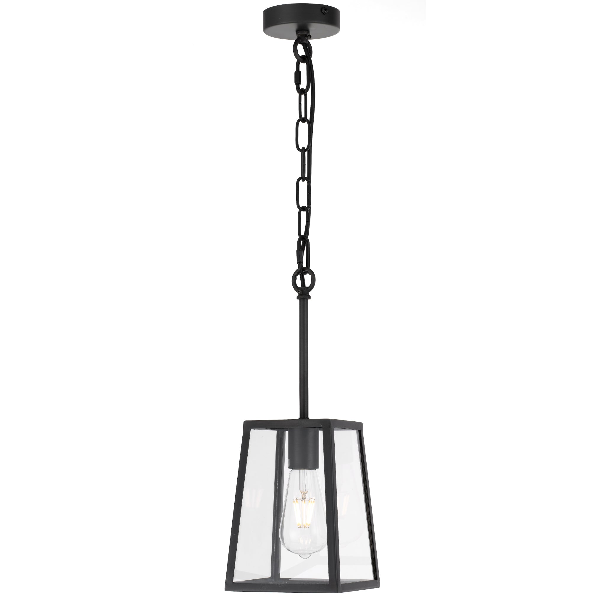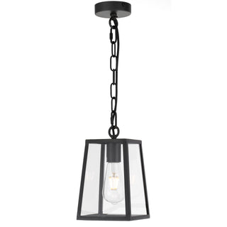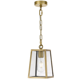 Cantena is a bold yet simple vintage outdoor pendant lamp. The tapered frame holds trapezoid clear glass and is suspended by a short rod with chain. The Cantena family is crafted in solid brass and finished in polished brass or brass painted in black. Available in 2 sizes, also as a wall lamp.