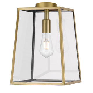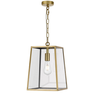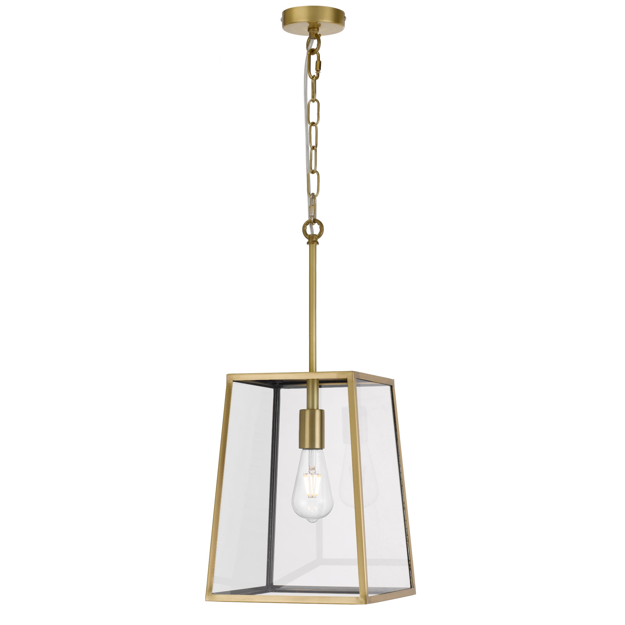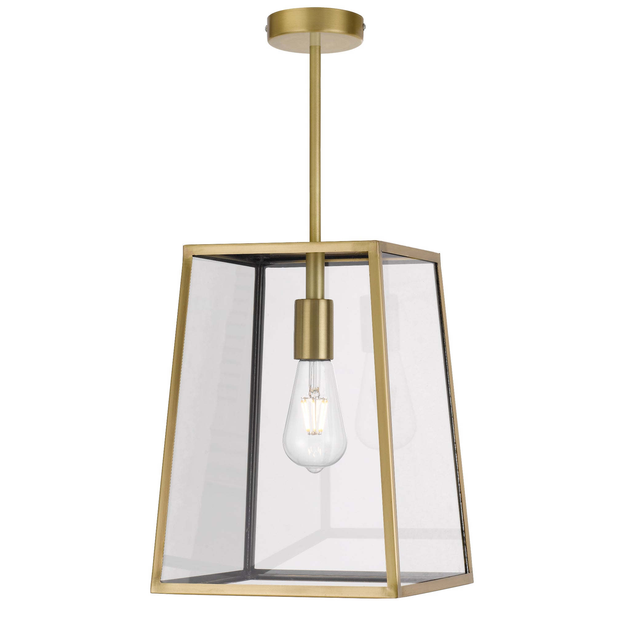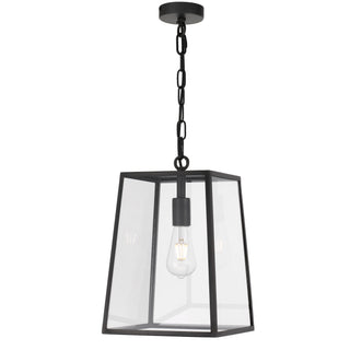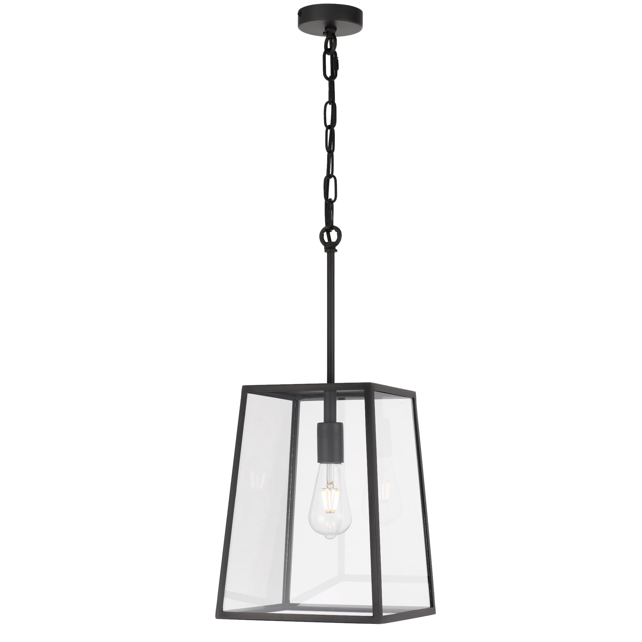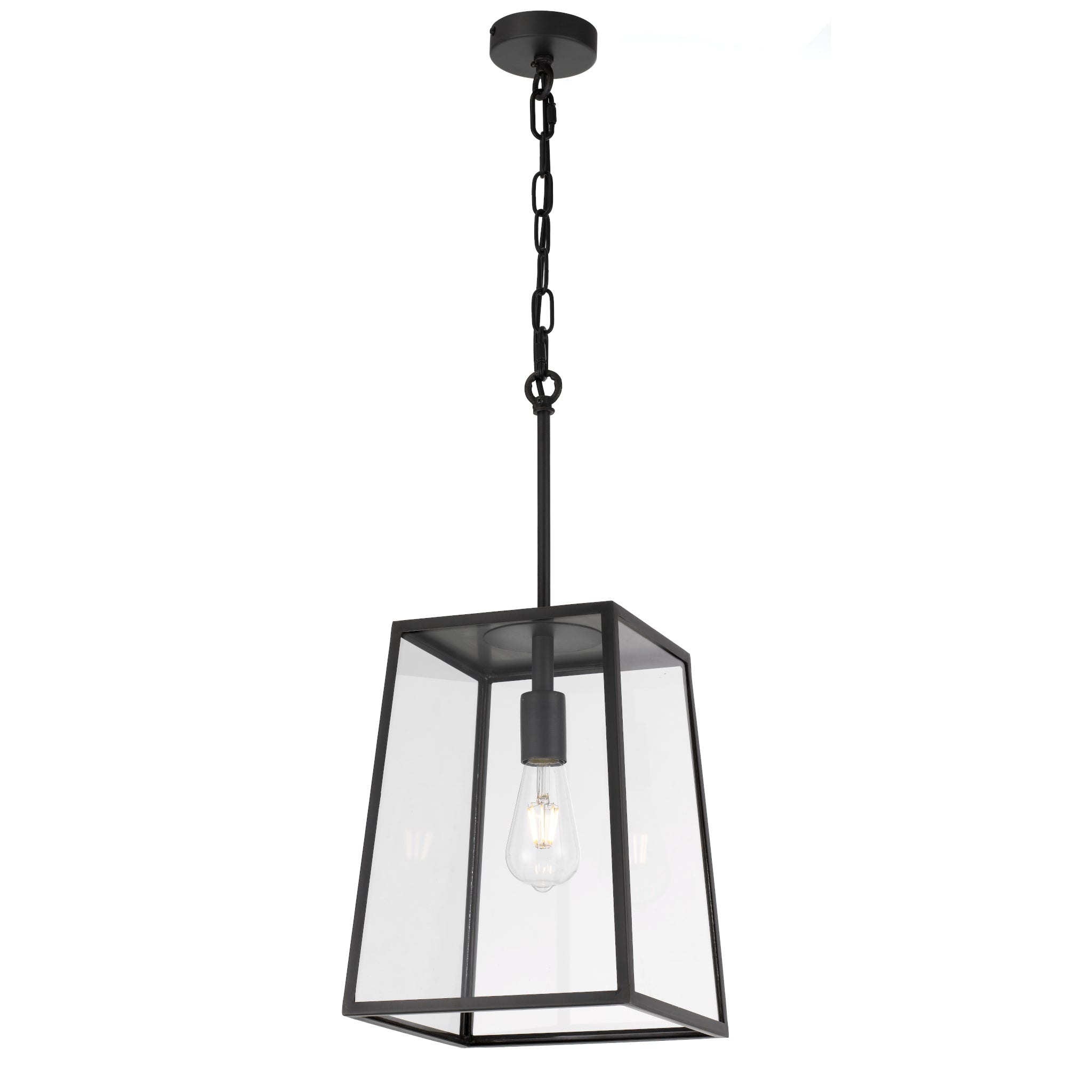 Cantena is a bold yet simple vintage outdoor pendant lamp. The tapered frame holds trapezoid clear glass and is suspended by a short rod with chain. The Cantena family is crafted in solid brass and finished in polished brass or brass painted in black. Available in 2 sizes, also as a wall lamp.