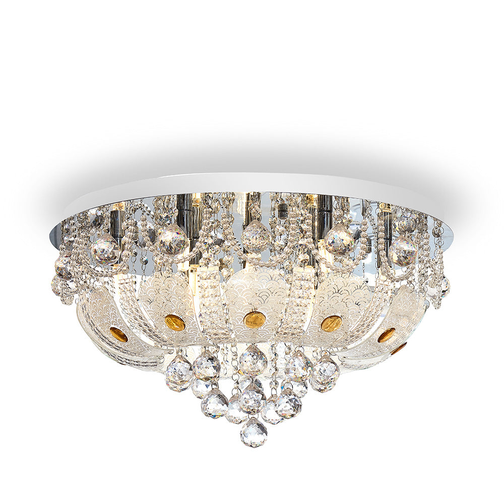 The Elanza is a classic, extravagant close to ceiling fixture. Glass leaves are hand screen printed and beaded with amber jubes and draped with clear optic crystal shapes. The stainless steel ceiling plate reflects the light source to provide a spectacular lighting effect. Available in 2 sizes.