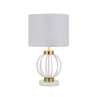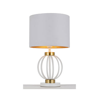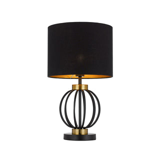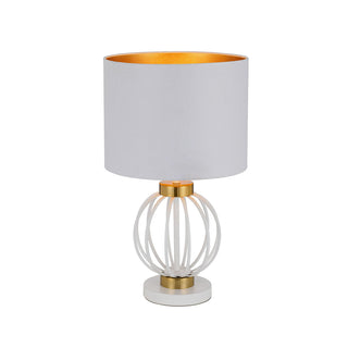 This Grada lamp mixes a cage-inspired round body fashioned of black finish metal with a high polished antique gold accents. A round, fabric hardback drum shade complete with inner gold truly delivers a luxe style. Available in black or white.