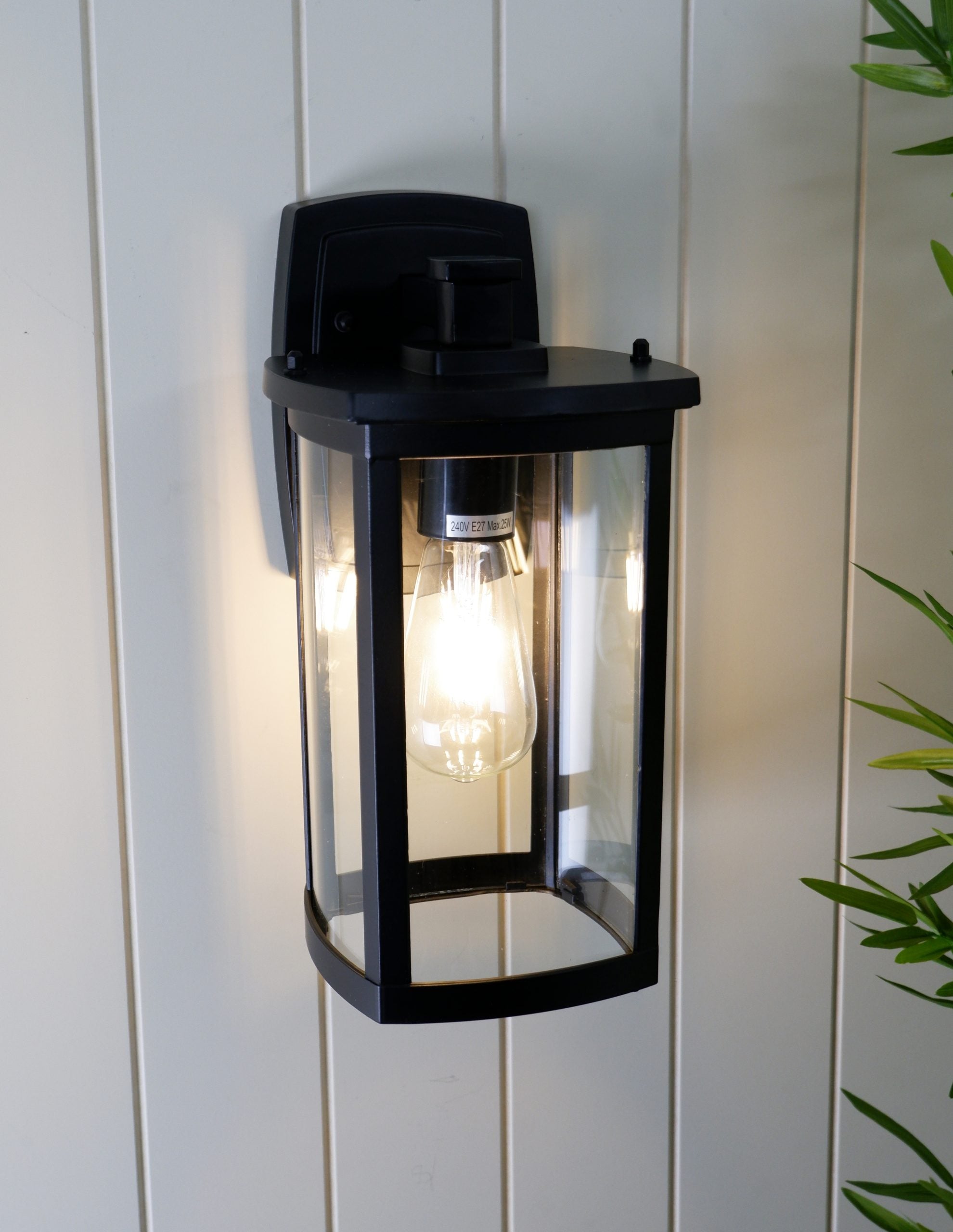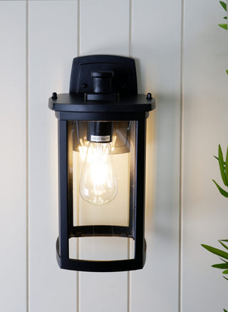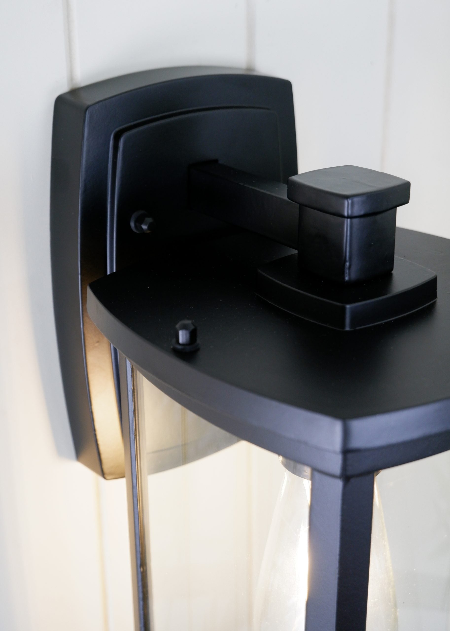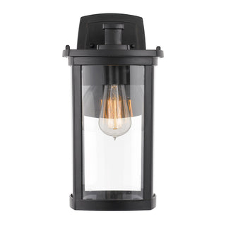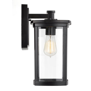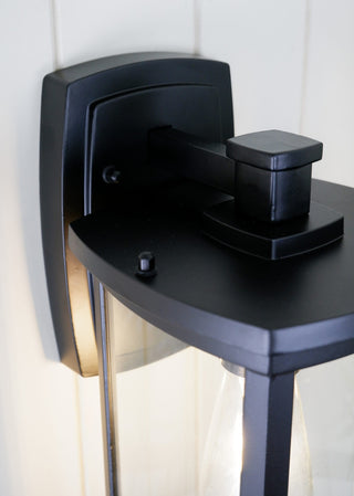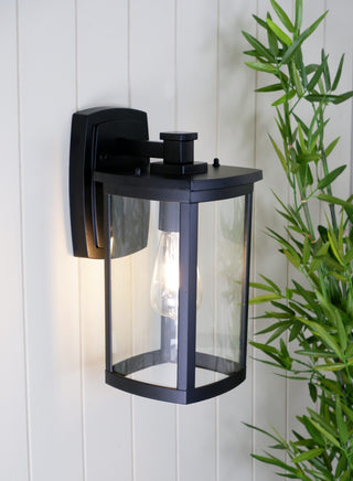 The rectangular frame and subtle curved lines on this mission-style outdoor wall light provide elegant appeal. The clear glass protects a single bulb providing bright illumination. Use this design on either side of a garage, entryway, or that special courtyard. Diecast aluminum construction finished in powder coat flat black.