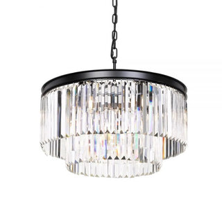 The Serene 9 pendant light offers a touch of glamour, drawing inspiration from classic Art Deco design, featuring a blackened bronze finished round structure with curtains of faceted crystal prisms subtly refract light, evoking the allure of the era. Other sizes are available within the Serene family.